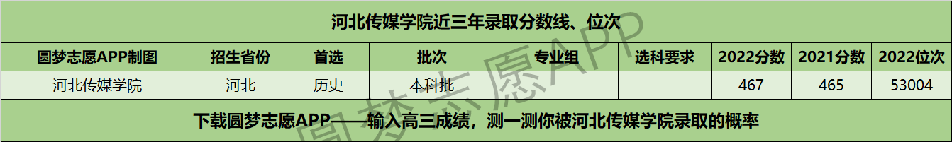 以河北传媒学院在河北近年首选历史的招生情况为例,学校2022年在本科批的最低分为467分,2021年在本科批的最低分为465分,两年的最低分范围为465~467分。