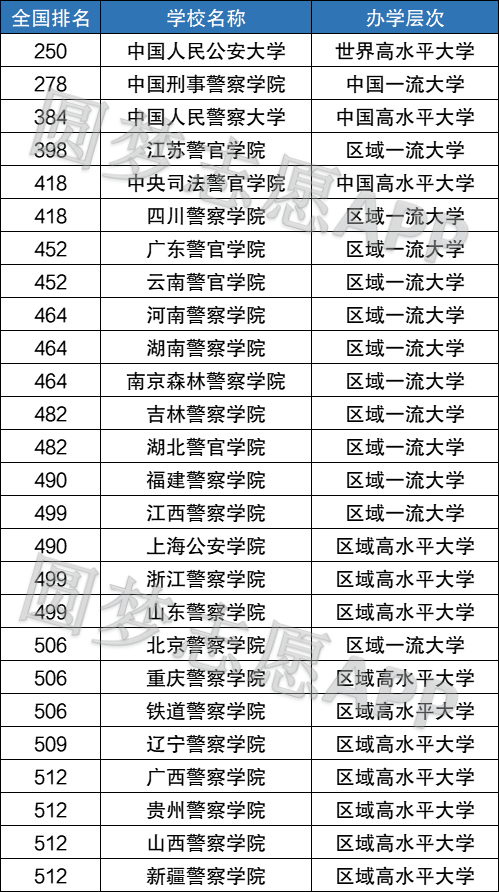 区域一流大学12所:江苏警官学院、四川警察学院、广东警官学院、云南警官学院、河南警察学院、湖南警察学院、南京森林警察学院、吉林警察学院、湖北警官学院、福建警察学院、江西警察学院、北京警察学院;