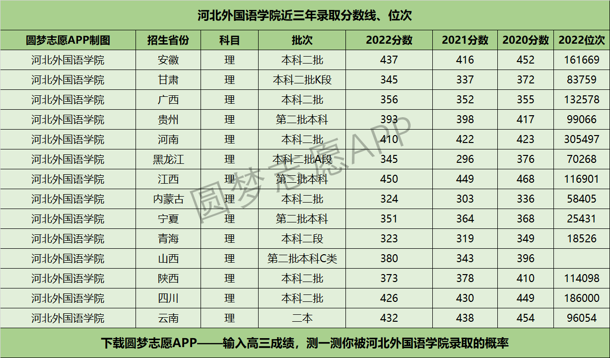 一、河北外国语学院近三年录取分数线及位次【理科版】