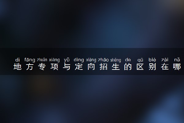 地方专项是地方重点高校招收农村学生专项计划的简称,其定向招收各省市实施区域的农村学生,招生学生为各省属重点高校,简单的说地方专项不招收外省市学生。定向培养比较特别,是特定区域、部门或单位招生或培养学生,毕业后需按计划到制定地区、部门或单位工作。