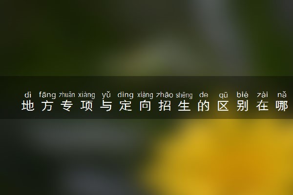 地方专项是地方重点高校招收农村学生专项计划的简称,其定向招收各省市实施区域的农村学生,招生学生为各省属重点高校,简单的说地方专项不招收外省市学生。定向培养比较特别,是特定区域、部门或单位招生或培养学生,毕业后需按计划到制定地区、部门或单位工作。