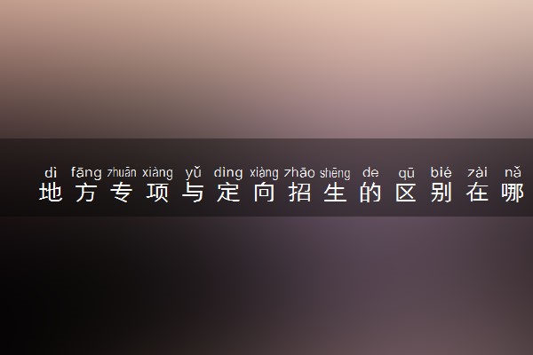 地方专项是地方重点高校招收农村学生专项计划的简称,其定向招收各省市实施区域的农村学生,招生学生为各省属重点高校,简单的说地方专项不招收外省市学生。定向培养比较特别,是特定区域、部门或单位招生或培养学生,毕业后需按计划到制定地区、部门或单位工作。