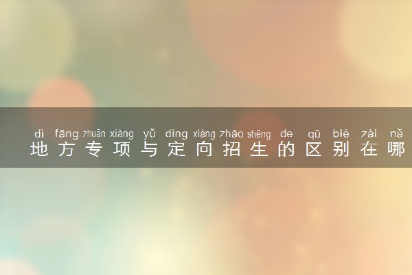 地方专项是地方重点高校招收农村学生专项计划的简称,其定向招收各省市实施区域的农村学生,招生学生为各省属重点高校,简单的说地方专项不招收外省市学生。定向培养比较特别,是特定区域、部门或单位招生或培养学生,毕业后需按计划到制定地区、部门或单位工作。